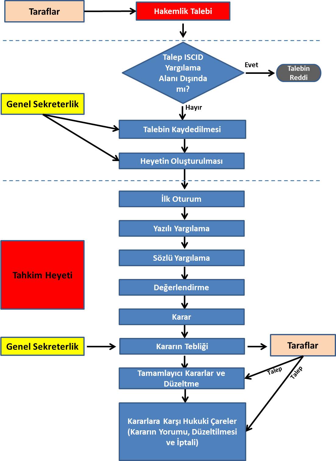 ICSID tahkiminde kararın tashihi ve ek karar, kararın düzeltilmesi (revizyon), kararın yorumu talep edildiğinde, nihai kararı veren heyet bu talepleri inceleyecektir. Nihai kararı veren heyet yeniden teşkil edilemiyor ise, yeni bir heyet teşkil edilecektir. Kararın iptali talep edildiğinde ise nihai kararın iptal edilip edilmeyeceğine iç hukuk düzeninde mevcut bulunan kanun yollarından farklı olarak bir üst mahkeme değil, yeni oluşturulacak bir ad hoc komiteye, gidilecek ve bu heyet karar verecektir.